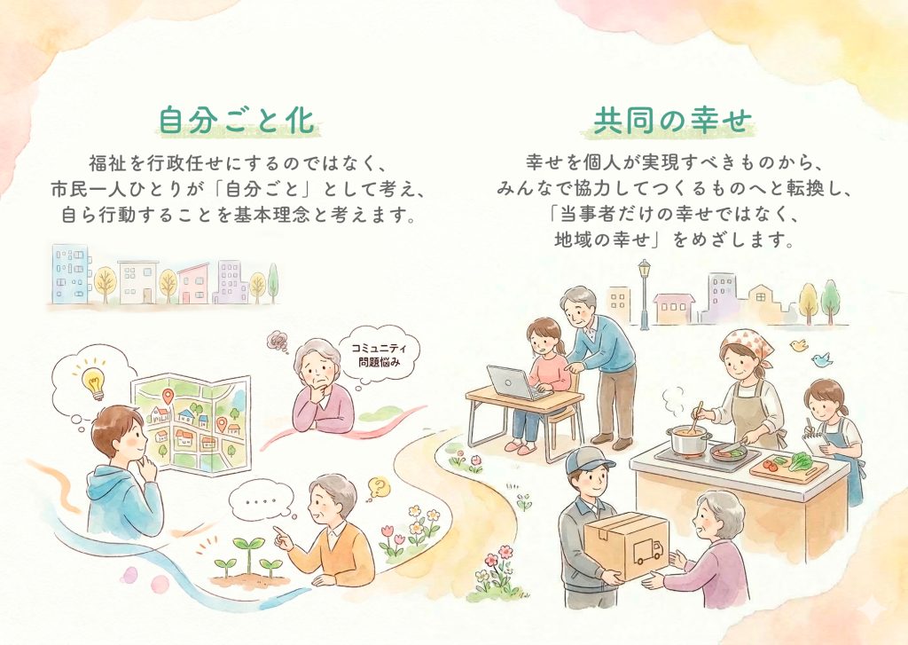 「福祉」を特定の社会的ハンデを持つ人への支援に限定せず、「地域住民全員の幸せ」と捉え直し、「みんなの幸せを追求します。